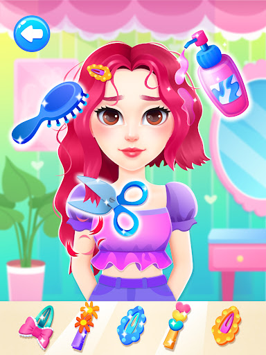 In this section of mobile haircut simulator for small children you will find a wide selection of tools to make a special hairstyle for your guest girl! Take a challenge and dye your hair an unusual color in hair style salon to create your hero even more attractive. Straighteners, curling irons, corrugations – all this will support you experiment with hair and find your inimitable style in girls android games for kids. You can also test using hair growth lotion and scissors to style both long and short hair in style android games for toddlers.